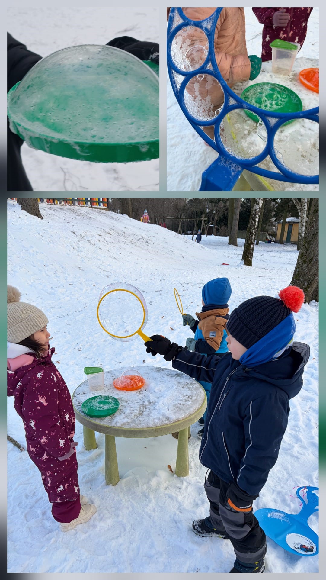 Bei eisigen Wintertemperaturen durften die Kinder unserer Kita ein ganz besonderes Naturwunder entdecken. Gemeinsam probierten sie das spannende Experiment Seifenblasen gefrieren aus. Warm eingepackt und mit Seifenlauge ausgestattet ging es nach draußen und schon sorgte die winterliche Kälte für viele staunende Augen und fröhliches Lachen.Kaum waren die Seifenblasen in die Luft gepustet, begann die Magie Langsam gefroren sie und auf ihrer Oberfläche entstanden zarte Eisstrukturen und wunderschöne Muster. Faszinierend beobachteten die Kinder, wie jede Seifenblase ihr eigenes kleines Kunstwerk zeigte, bevor sie schließlich zerplatzte. Die Sonnenknirpse schauten ganz genau hin, tauschten ihre Entdeckungen aus und fieberten jeder neuen Seifenblase gespannt entgegen.Dieses Experiment schenkte nicht nur einen zauberhaften Wintermoment, sondern bot auch eine tolle Lerngelegenheit. Spielerisch erfuhren die Kinder, wie Kälte wirkt und was passiert, wenn Wasser gefriert. Dabei wurde ihre Neugier geweckt und das aufmerksame Beobachten ganz nebenbei gefördert.Ein einfacher Versuch mit großer Wirkung und ein winterliches Erlebnis, das unseren Knirpsen bestimmt noch lange ein Lächeln ins Gesicht zaubert.Eure Sonnenknirpse mit Julia und Teresa |