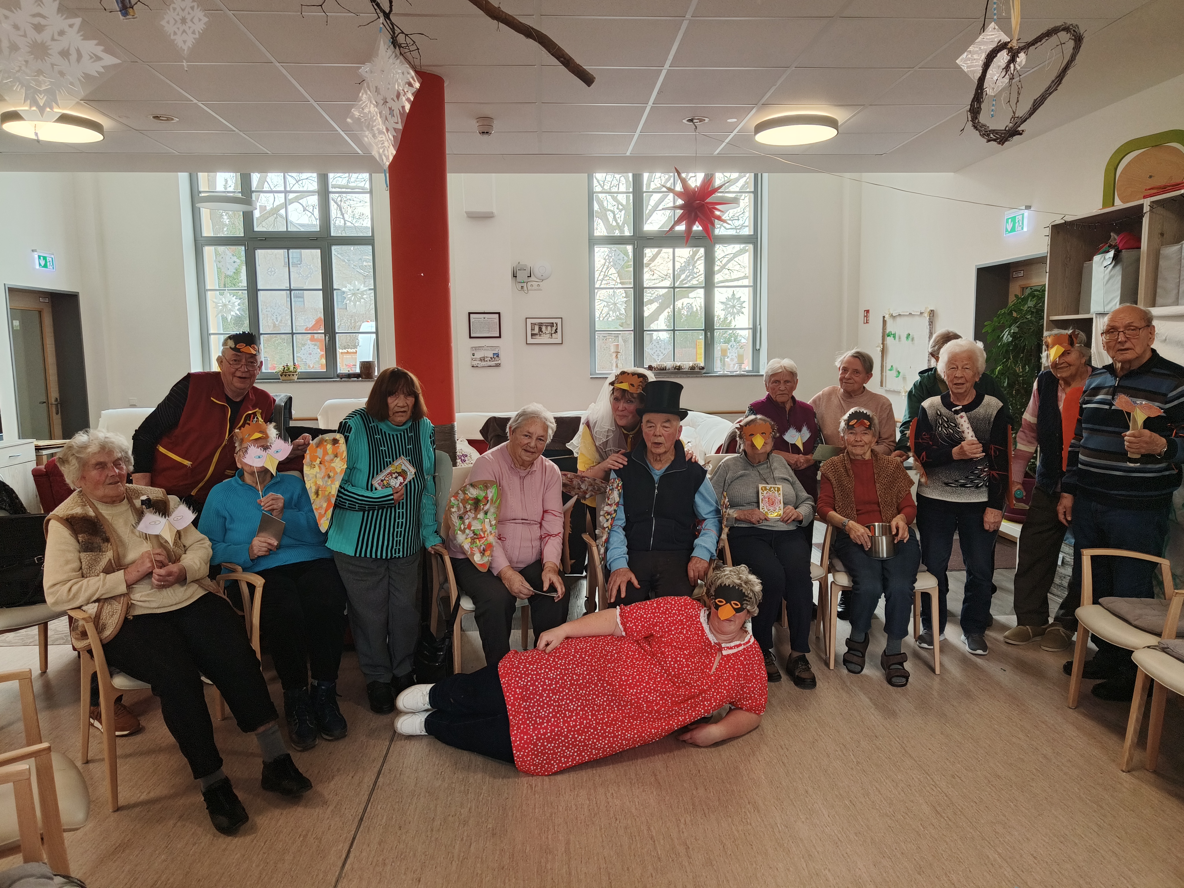 ,, Die Reife des Lebens und unsere Erfahrungen lassen uns bewusst werden, wie wertvoll ein Ort der Sicherheit, sozialen Einbindung und guten Versorgung ist, gleichbedeutend wie ein warmes, sicheres Nest. Am 25.Januar wird nach sorbischem Brauch die Vogelhochzeit gefeiert. Dabei gedenkt man den kleinen gefiederten Freunden, da sie uns auch in der kalten Winterzeit Freude bereiten. Als Dank für die regelmäßige Fütterung überreichen die einheimischen Vögel kleine Nester in Form von süßem Gebäck. Wir fertigten gemeinsam mit den Gästen Kostüme an und wer Lust hatte, konnte in eine Rolle schlüpfen. Dazu gab es süße Leckereien und musikalische Umrahmung. Wir erlebten einen wunderschönen Vormittag gemäß der Erzählung der Vogelhochzeit. |