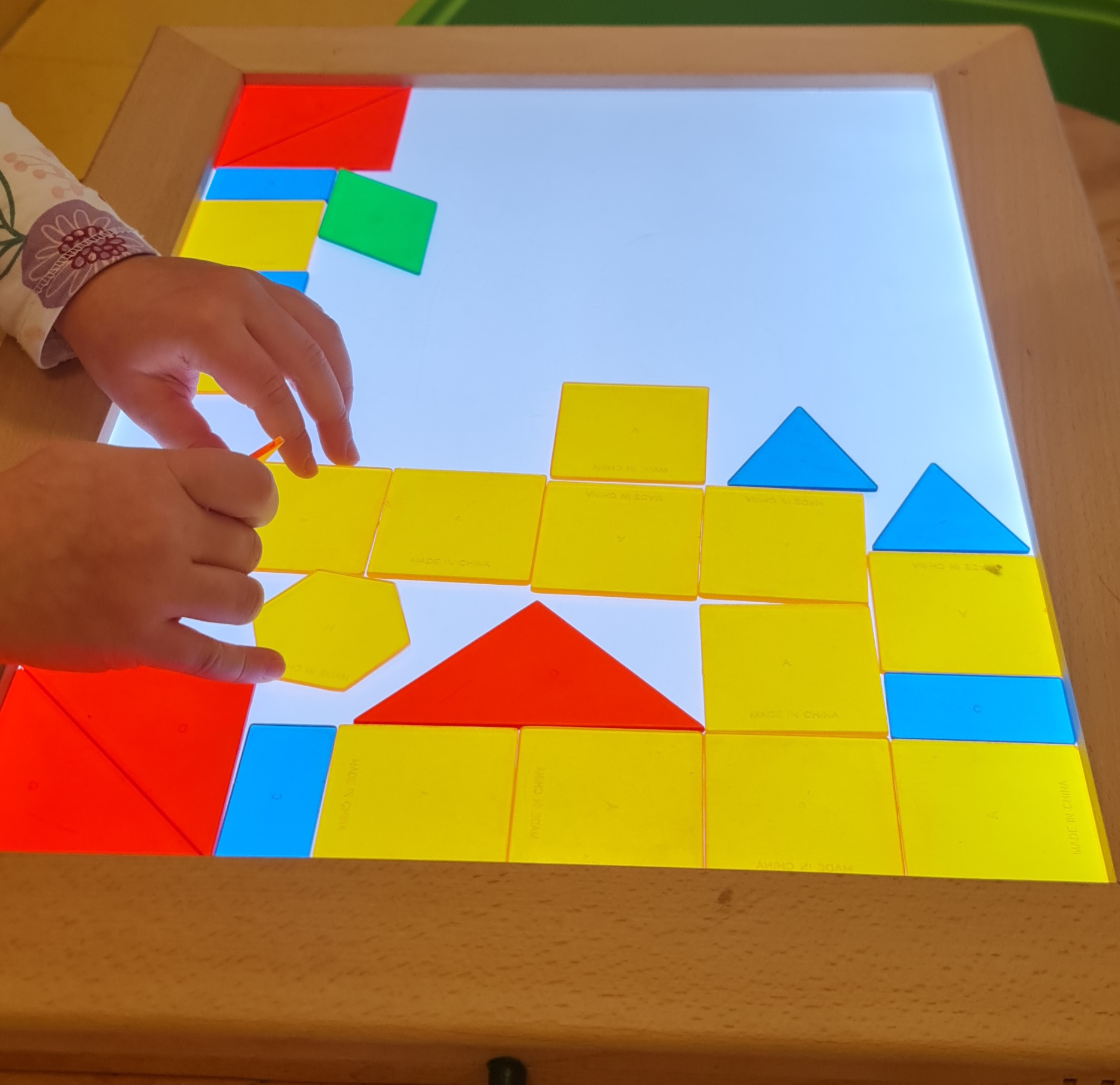 Heute spielten die Kinder auf der Leuchtplatte mit durchsichtigen Bausteinen in verschiedenen Formen und Farben. Quadrate, Dreiecke und andere Formen lagen auf der hell leuchtenden Fläche und begannen in Gelb, Blau, Rot und Grün zu strahlen. Mit viel Konzentration legten die Kinder die Bausteine nebeneinander, ordneten sie und setzten sie zu kleinen Bauwerken und Mustern zusammen. Die leuchtenden Farben machten das Spiel besonders spannend und luden zum Ausprobieren und Verändern ein.Durch dieses Angebot wurden mehrere Bildungsbereiche angesprochen. Die Kinder erfuhren eine intensive ästhetische Wahrnehmung, da Licht, Farben und Formen bewusst erlebt wurden. Beim Erkennen, Benennen und Zuordnen der unterschiedlichen Formen und Farben sammelten sie mathematische Grunderfahrungen. Das gezielte Greifen und Platzieren der Bausteine förderte die Feinmotorik und die Hand-Auge-Koordination. Gleichzeitig wurde das Denken angeregt, da die Kinder überlegten, wie die Formen zusammenpassen und eigene Ideen umsetzten. Im gemeinsamen Spiel entstanden Austausch, Freude und erste soziale Lernerfahrungen. |