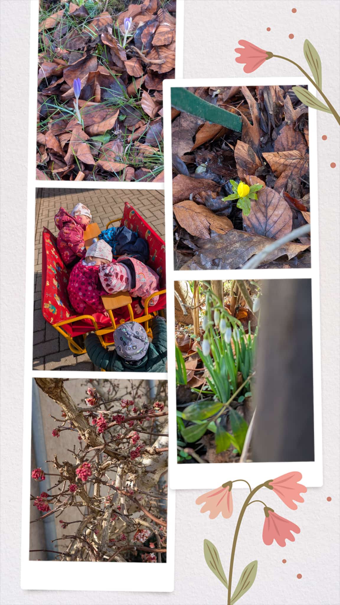 Der Frühling ist eine besondere Jahreszeit, die von vielen mit Freude erwartet wird. An einem sonnigen Tag im März machten sich die Miniknirpse auf eine spannende Entdeckungsreise, um den Frühling zu finden. Mit offenen Augen und Ohren gingen die Kinder durch die Natur, neugierig darauf, was sich verändert hat.Sie liefen durch den Garten und begannen, die ersten Anzeichen des Frühlings zu finden. Schon bald entdeckten sie die Ersten kleinen Frühlingsboten zarte Schneeglöckchen, die sich aus der Erde schoben. Anzeichen, dass der Frühling nicht mehr weit weg war. Durch den Schnee hatten sich die Blümchen gekämpft.Bei unserem Stadtrundgang entdeckten wir die gelben Winterlinge, die bei Sonnenschein die Wiesen zum Strahlen bringen. Wir erfreuten uns an den Krokussen, die lila und gelb blühten. Es war, als ob der Frühling mit all seinen Farben und Formen vor uns lag.Doch die Kinder hörten die neue Jahreszeit auch mit ihren Ohren. Über ihnen zwitscherten die Vögel fröhlich in den Bäumen. Nach dem langen Winter waren die Vögel zurückgekehrt.Mit großen Augen und vielen Eindrücken waren die Knirpse in die Kita zurückgekehrt. Doch die Kleinsten schliefen bei der Entdeckungsreise ein. Sie hatten den Frühling gefunden nicht nur als Blumen und Vögel, sondern auch als ein Gefühl von Lebendigkeit und Fröhlichkeit, das nun die Natur erfüllte. Es war, als ob die ganze Welt aus dem Winterschlaf erweckt war. Der Frühling ist die Zeit des Neubeginns, der Farben und der Vögel. Die Kinder haben ihn mit all ihren Sinnen erlebt.Wir wünschen allen Lesern eine traumhafte Frühlingszeit mit wunderbaren Spaziergängen in der erwachenden Natur, die nie ihren Zauber bei uns Menschen verlieren sollte. Genießen Sie die ersten warmen Sonnenstrahlen und erfreuen sich am Wandel der Natur.Es grüßen die Miniknirpse mit Jana und Marlies |