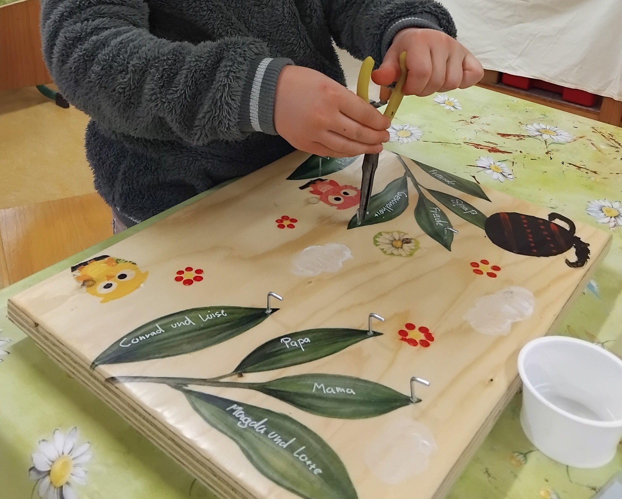 Stellt euch vor, ihr wollt schnell los, bloß noch die Tür abschließen und Verflixt noch mal! Wo ist der Schlüssel? Diese Situation kennt sicherlich jeder. Was kann da helfen? Ein fester Platz, an dem der Schlüssel abgelegt wird. Wie wäre es da mit einem Schlüsselbrett? Vor einiger Zeit hat eine Frau uns Hortkindern Teebretter geschenkt. Ein Teebrett? Es dient als Unterlage und Servierbrett. Darauf werden alle Gegenstände angeordnet, die man für die Teezeremonie (die Zubereitung und das Trinken) benötigt. Eine japanische Teezeremonie besteht aus mehreren Schritten Der Gast wandelt auf einem Gartenpfad, um sich auf die eigentliche Zeremonie vorzubereiten. Der Gastgeber lädt ins Teehaus ein. In einem Warteraum begrüßt er seine Gäste mit heißem Wasser. Die Gäste wandeln wieder auf dem Gartenpfad. Der Gastgeber stellt frisches Wasser und eine Schöpfkelle bereit, womit sich die Gäste Mund und Hände waschen. Sie entledigen sich somit symbolisch alles Üblem. Beim Betreten des Teeraumes lassen sie sich auf die Knie nieder, um Demut und Respekt zu zeigen. Es folgt ein mehrgängiges Menü mit leichten Speisen, das Kaiseki. Nach dem Essen werden die Gäste noch einmal in den Warteraum gebeten. Anschließend begeben sie sich in den eigentlichen Teeraum. Hier wird nun nach einer festgelegten Zeremonienfolge Tee serviert. Das klingt spannend, aber kaum jemand von uns nimmt sich so viel Zeit zum Teetrinken. Was sollten wir nun aber mit den Teebrettern tun? Eine Erzieherin hatte die Idee, daraus Schlüsselbretter anzufertigen. Aus etwas Altem ein neues Ordnungssystem schaffen. Gesagt getan. Wir verzierten die Bretter mit der Serviettentechnik und bemalten sie zusätzlich mit Acrylfarben ganz nach unseren individuellen Vorstellungen. Mit Acrylstiften schrieben wir die Namen der Schlüsselbesitzer und Wünsche darauf. Nach dem Lackieren drehten wir kleine Haken in die Bretter. So entstanden einzigartige Schlüsselbretter. Einige davon versteckt der Osterhase ganz heimlich für Mama und Papa.Die Handwerker und Künstler aus dem Hort der ASB Kita Schlumpfenland Langenwolmsdorf