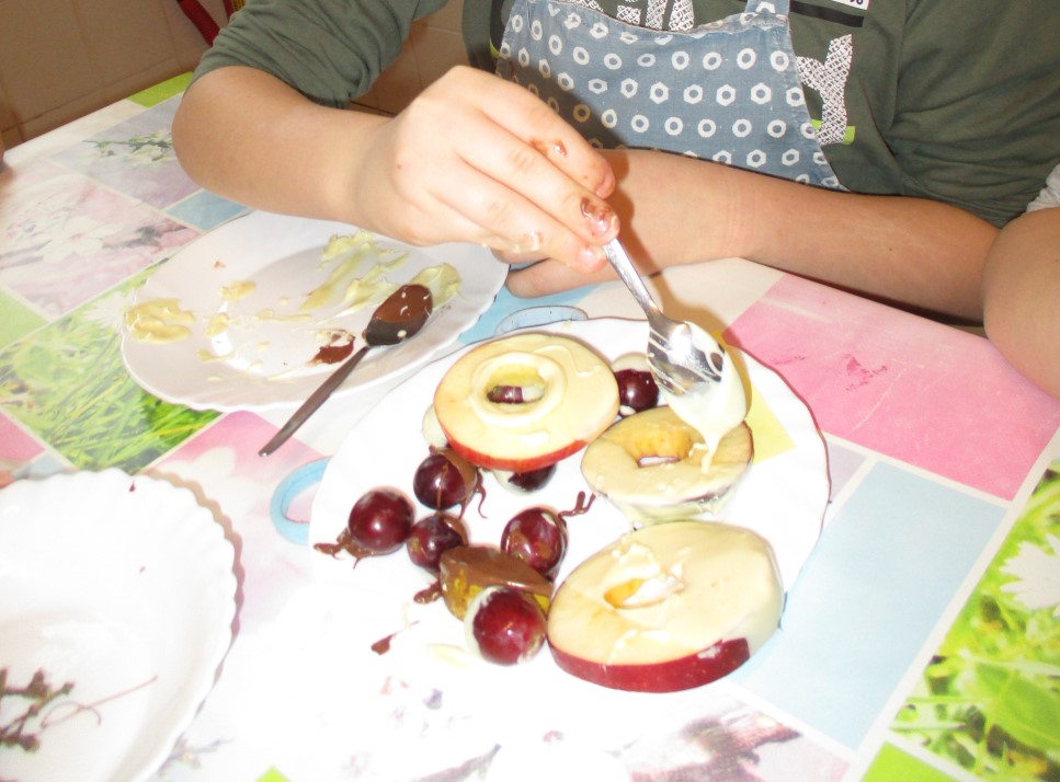 Tagesgruppe drehte sich alles rund um die Schokolade. Dabei hat ein Jeder seinen ganz eigenen Geschmack. Während ein Großteil der Kinder von Vollmilch und weißer Schokolade schwärmte, gab es auch einzelne Kinder, die dunklere Schokolade bevorzugen. Aber können wir auch blind erkennen, um welche Schokolade es sich handelt? Das testeten die Kinder natürlich gerne aus und probierten verschiedene Schokoladensorten mit verbundenen Augen. Dabei stellte sich heraus, dass es gar nicht immer so leicht ist, die Sorten zu unterscheiden. Lediglich bei der Zartbitterschokolade lagen alle Kinder richtig, da ihr Geschmack herb ist. Unterdessen ließen wir die Schokoladentafeln im Wasserbad langsam schmelzen bis eine cremige Soße entstand. Im Anschluss verzierten die Kinder Weintrauben, Bananen, Äpfel und Birnen mit weißer und brauner Schokolade. Jeder konnte selbst entscheiden, welche Früchte er garniert. Einige Kinder probierten sogar schöne Muster aus. Das Auge ist ja bekanntlich mit. So schön das Obst auch gestaltet wurde, war seine Gegenwart doch sehr vergänglich, denn spätestens zum Mittagessen wurde alles ratzifatzi aufgegessen. So macht Obst essen Spaß!