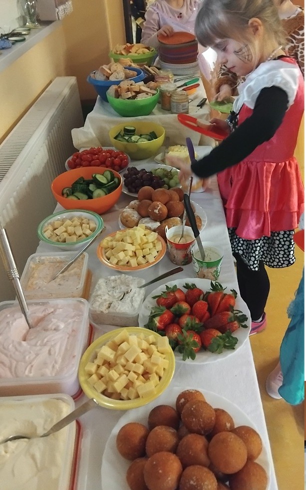 Im 13. Jahrhundert beschrieben Mönche und Nonnen schwarze Stickereien auf weißem Grund mit bunt. Das mittelhochdeutsche Wort bezeichnete schwarz-weiße (gefleckte) Felle bzw. Pelze. Heute noch sagt man zu schwarz-weißen Kühen schwarz-buntes Vieh. Aber was hat das eher unbunte Schwarz-Weiß mit dem bunten Treiben zur Faschingszeit zu tun? Außerdem wäre Schwarz und Weiß auf Dauer langweilig, wo es doch so viele schöne Farben gibt. Nun, bunt ersetzte im Mittelalter zunehmend das mittelhochdeutsche Wort v?h, das wiederum vielfarbig bedeutete. Inzwischen verwendet man bunt auch als Synonym (als gleichwertiges Wort) für abwechslungs- und ereignisreich. Das kommt dem Geschehen in der zweiten Winterferienwoche schon näher. Der Farbenreichtum unserer Welt bildete die Grundlage für die verschiedensten Ferienaktionen. Wir buken bunten Kuchen. Im Geschmackstest siegte der Limokuchen mit dem Konfettiguss über den Schokoladenkuchen mit der Smartie-Verzierung. Mit Hilfe von Grenadine, alkoholfreiem Blue Curacao, Wasser und Ananas-Orangen-Mango-Saft mixten wir einen Regenbogen-Cocktail. Wenn man die Flüssigkeiten nacheinander vorsichtig mit einem Löffel ins Glas gibt, schichten sie sich Dank ihrer unterschiedlichen Dichte wie von Zauberhand selbst. Der rote Grenadine ist am schwersten und bleibt unten. Das mit blauem Curacao gemischte Wasser ist am leichtesten und schwimmt oben. Die Ränder der Schichten vermischen sich leicht. So entsteht (von unten nach oben) ein rot-orange-gelb-grün-blauer Cocktail. Lecker und farbenfroh! Nicht nur in der Küche, sondern auch in der Turnhalle beschäftigten wir uns mit den Farben. So versuchten wir, sie bei dem Spiel Wenn der König durchs Land zieht einzufangen. In Märchenrätseln versteckten sich verschiedene Farben. Wer sie erriet, sollte so schnell als möglich in ihr Zuhause rennen. Mit diesen und weiteren Spielen verging der Vormittag wie im Flug. Zum Faschingsdienstag verkleideten wir uns als Polizisten, Prinzessinnen, Hexen, Teufel, Ninjas, Cowboys, feine Damen, Füchse u.v.m. und genossen zum Frühstück ein vielfältiges Buffett mit verschiedenfarbigen Aufstrichen rote Beete, Avocado, Curry, Aubergine, Frischkäse, Kräuterquark, Lachs, Thunfisch bzw. Butter mit Kräutersalz. Außerdem begrüßten wir den Langenwolmsdorfer Karnevalsverein mit einem lauten Lawodo Zin Zin! und veranstalteten eine lustige Polonaise durch die Turnhalle. Eine tolle Party! Zum Wochenabschluss schminkten wir unsere Gesichter bzw. Arme und Hände mit Theaterfarben. Von wilden Tieren, Fantasiewesen, Regenbögen bis zu bunten Blumen war alles dabei. Die Hortkinder aus der farbenfrohen ASB-Kita Schlumpfenland Langenwolmsdorf