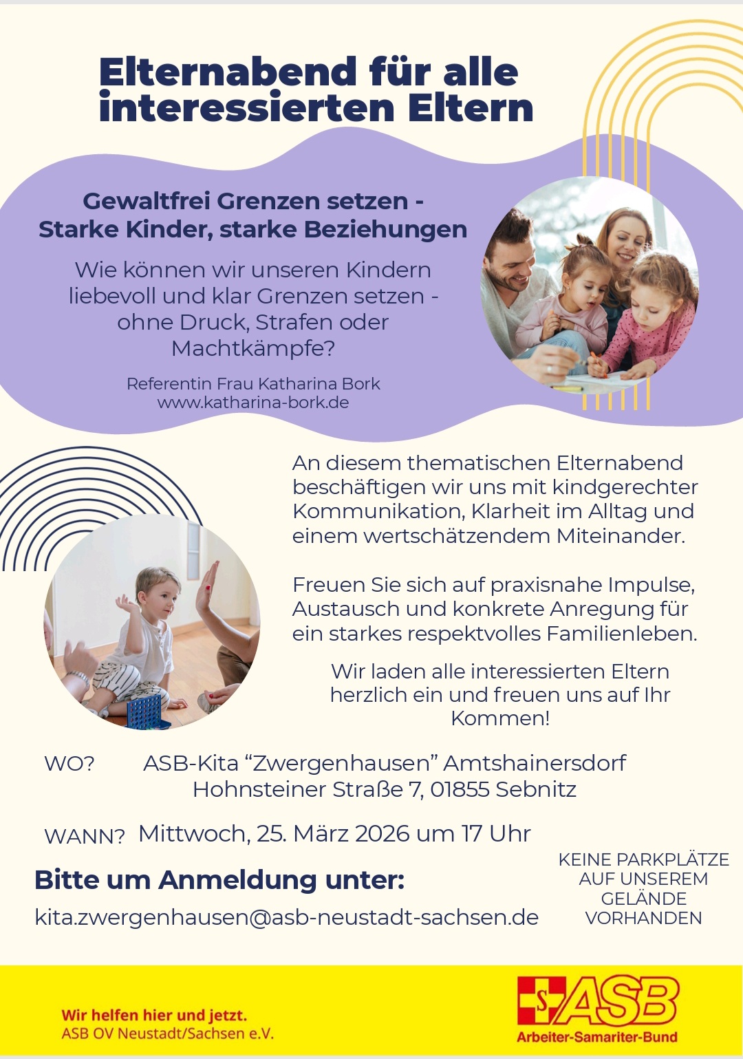 Wie können wir unseren Kindern liebevoll und klar Grenzen setzen - ohne Druck, Strafen oder Machtkämpfe?Wir laden alle interessierten Eltern und Fachkräfte am 25. März um 17 Uhr zu uns in die ASB-Kita Zwergenhausen Amtshainersdorf nach Sebnitz ein.