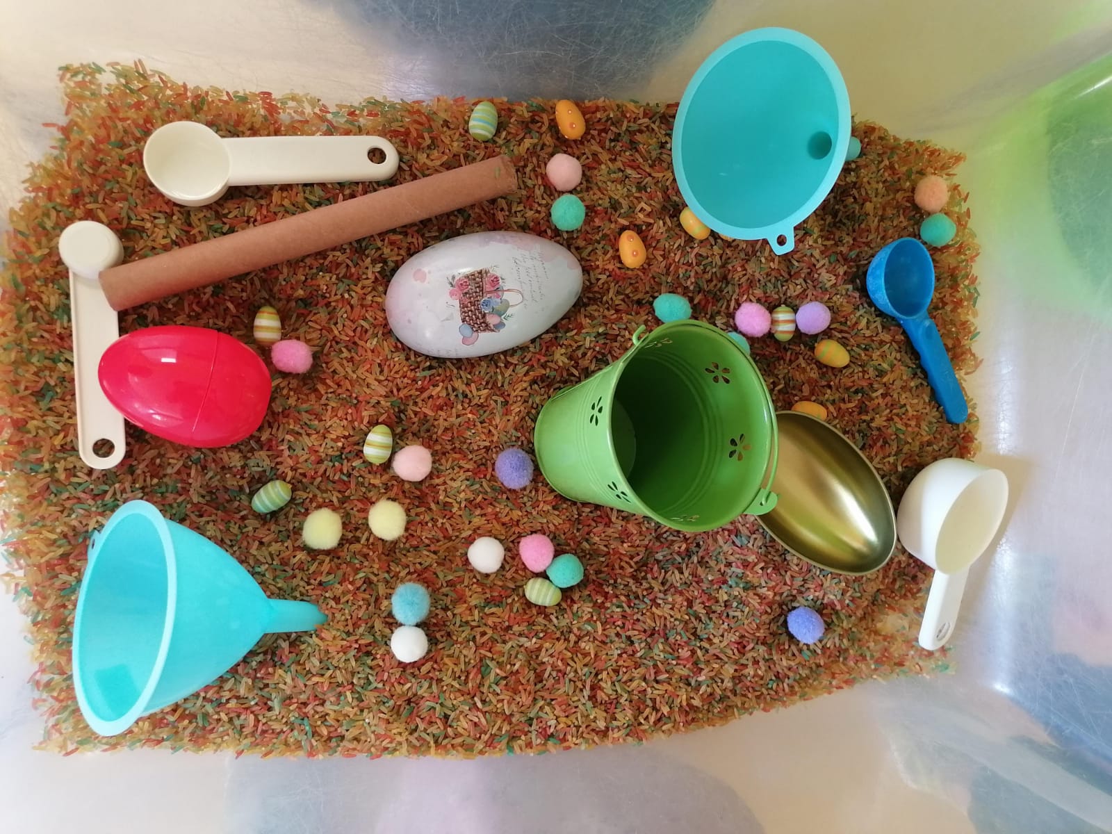 Unsere Krippenkinder hatten viel Freude mit ihrer spannenden Schüttwanne. Und dabei lernten sie so ganz nebenbei auch noch einiges mehrDer gefärbte Reis, die weichen Pompons und die glatten Eier bieten unterschiedliche Oberflächenreize. Die Kinder fühlen den Widerstand des Materials und hören das leise Prasseln, wenn der Reis durch die Trichter fließt.Das gezielte Greifen mit den kleinen Löffeln, das Befüllen der schmalen Trichteröffnungen und das Balancieren der Eier erfordern höchste Präzision der kleinen Fingermuskulatur.Ganz nebenbei entdecken die Kinder Mengenverhältnisse. Sie lernen spielerisch Wie viele Löffel passen in den grünen Eimer?? oder Ist der Trichter zu voll, verstopft er.? Das ist die Basis für das spätere Verständnis von Volumen und Gewicht.Solche explorativen Spiele (das Erforschen von Material) wirken oft sehr beruhigend. Die Kinder versinken in ihr Tun, schalten Umgebungsreize aus und stärken so ihre Aufmerksamkeitsspanne.Ein Löffel wird zum Flugzeug, der Reis zum Futter für die Osterhasen oder die Eier werden versteckt und wiedergefunden.Kurz gesagt In dieser Wanne werden kleine Forscher zu großen Entdeckern der physikalischen Welt. |