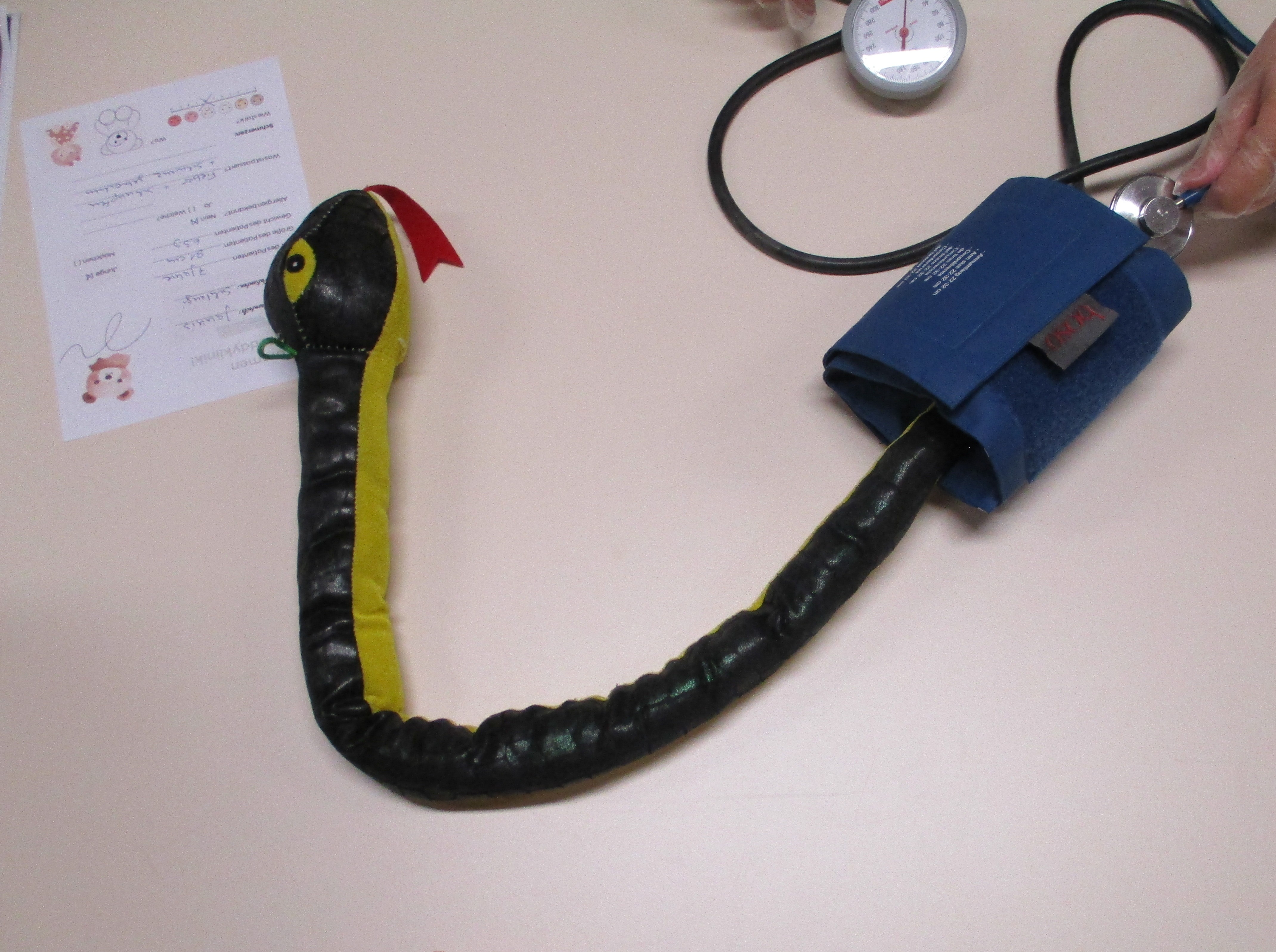 Ich, der Rabe Pfiffikus, habe heute etwas ganz Besonderes beobachtet Der Turnraum wurde kurzerhand in eine liebevoll gestaltete Teddyklinik verwandelt und ich durfte alles aus meiner Perspektive mitverfolgen.Die Pflegeschülerinnen und Pflegeschüler aus dem 3. Lehrjahr des Asklepios Bildungszentrums haben ganze Arbeit geleistet. Schon beim ersten Blick fiel auf, wie viel Mühe sie sich gegeben haben Verschiedene Stationen waren aufgebaut, fast wie in einem echten Krankenhaus nur deutlich freundlicher und kindgerechter.Die Vorschulkinder brachten ihre Kuscheltiere oder Puppen mit, die an diesem Tag die kleinen Patientinnen und Patienten waren. Zunächst ging es zur Anmeldung. Dort wurden sorgfältig alle wichtigen Daten erfasst Name, Alter, Größe, Gewicht und natürlich die Beschwerden des Kuscheltiers.Im Anschluss folgten die Untersuchungen. Es wurde Blutdruck gemessen, geröntgt und genau hingeschaut. Danach erhielten die Kuscheltiere einen Verband und sogar eine Spritze stets begleitet von den Kindern, die ihre Schützlinge tapfer unterstützten.Am Ende der Behandlung bekamen die Kinder liebevolle Ratschläge, wie die kleinen Patienten getröstet werden können, ein Rezept für die Apotheke? und eine Urkunde. In der Apotheke? wartete außerdem eine besondere Medizin Gummibärchen oder Smarties, die für strahlende Gesichter sorgten.Auch an einen Wartebereich war gedacht. Dort konnten die Kinder malen oder spielen und die Zeit bis zur Behandlung überbrücken.Es war deutlich zu sehen, wie viel Freude diese Aktion allen Beteiligten bereitet hat. Die Teddyklinik war ein voller Erfolg, und die Vorfreude auf eine nächste Veranstaltung ist bereits groß.Ein herzliches Dankeschön gilt den Pflegeschülerinnen und Pflegeschülern sowie der Lehrerin des Asklepios Bildungszentrums für die gelungene Organisation dieses besonderen Tages.Euer Pfiffikus |