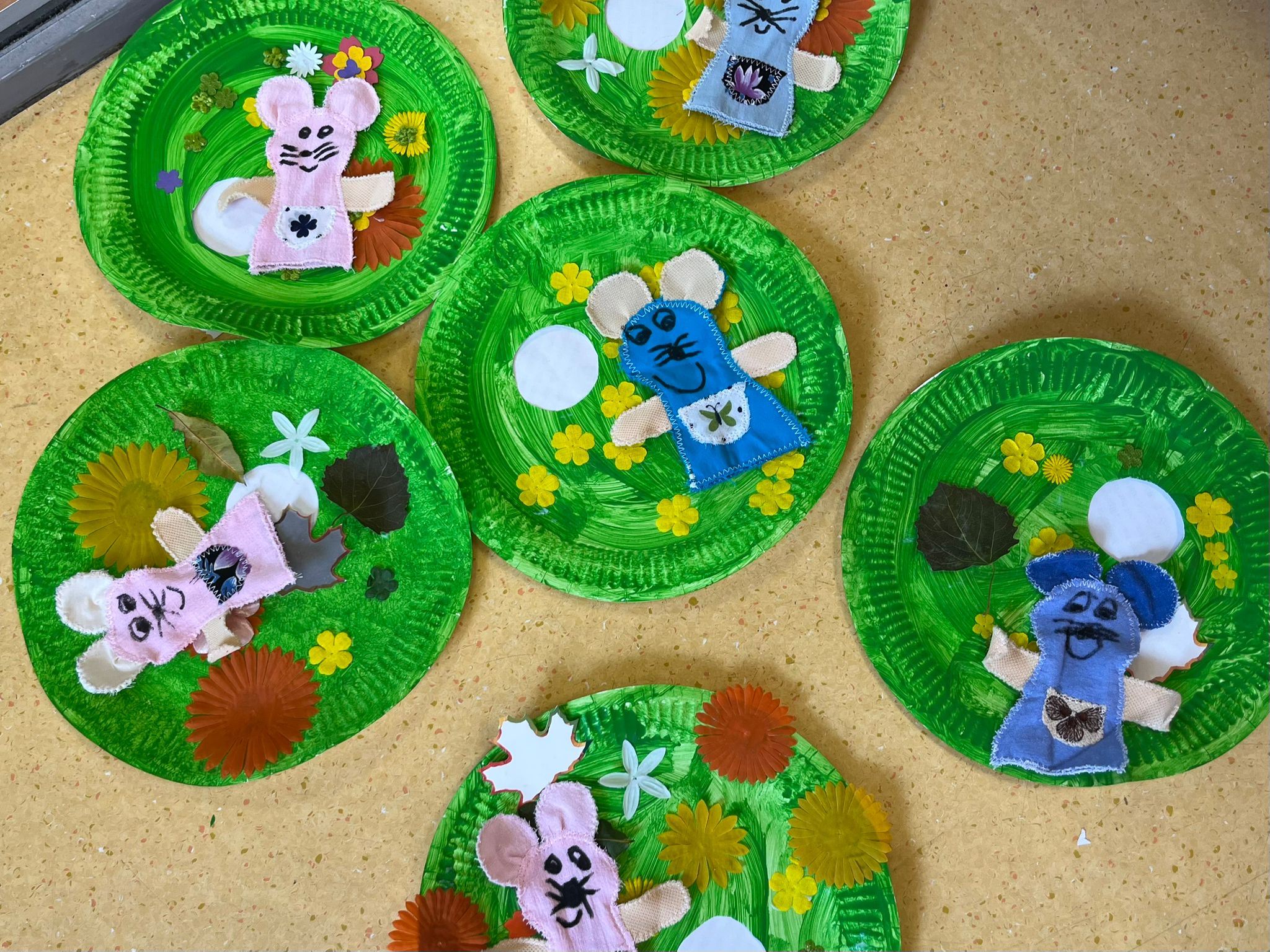 Phantasievoll Sprache entwickeln Am Mittwoch entdeckten wir bei unserer Entdeckungstour auch ein kleines Mauseloch. In diesem Loch wohnt Klaus, die Maus?. Wir bastelten gestern und heute eine Papptellergeschichte. Pappteller anmalen, das ist unsere Wiese, Loch einschneiden und am folgenden Tag kommen Blumen und Blätter auf die Wiese. Eine kleine Mausfingerpuppe bekommt ein Gesicht und so nebenbei lernen wir noch einen kleinen lustigen Maustext. Nun können wir ein kleines Fingerpuppenspiel. |